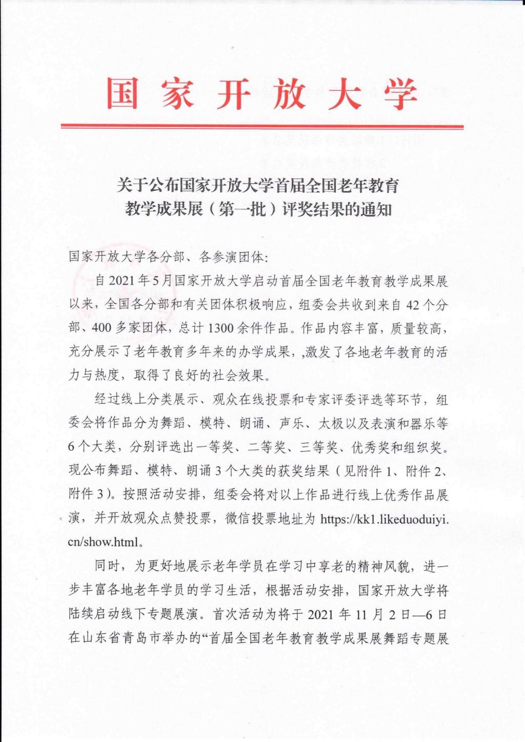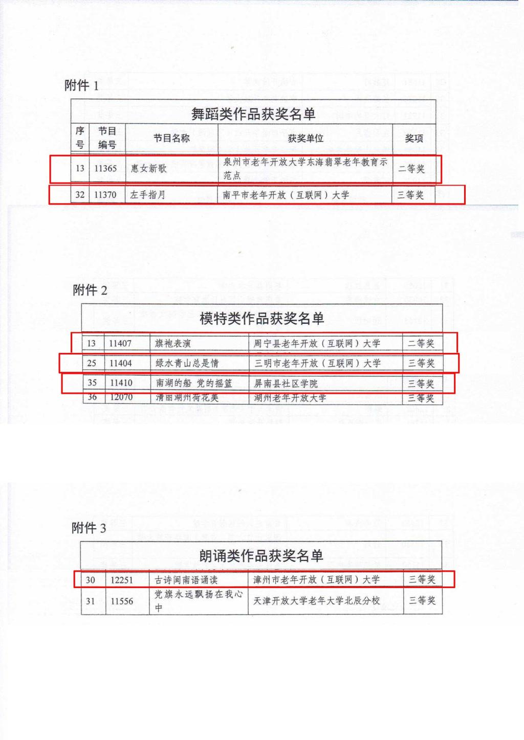 日前,国家开放大学公布首届全国老年教育教学成果展(第一批)评奖结果。福建老年开放(互联网)大学体系共6个节目获奖,其中舞蹈类2个,模特类3个,朗诵类1个。