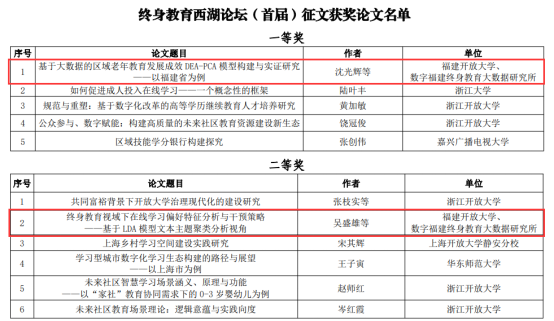 近日,浙江开放大学公布了“终身教育西湖论坛(首届)征文”的评选结果。我校终身教育服务中心、数字福建终身教育大数据研究所报送的《基于大数据的区域老年教育发展成效DEA-PCA 模型构建与实证研究 ——以福建省为例》、《终身教育视域下在线学习偏好特征分析与干预策略——基于 LDA 模型文本主题聚类分析视》和《知识媒体传播视角下的终身教育场域建构探析》三篇论文分别荣获一等奖、二等奖和三等奖。