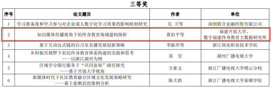 论文《知识媒体传播视角下的终身教育场域建构探析》(作者:黄伯平等)通过对终身教育内涵的梳理,引入知识媒体传播概念拓展终身教育的维度,为新技术与传播手段的嵌入提供融合框架,以福建省终身教育推进的实践案例为样本,分析终身教育场域建构的相关问题,为相关的教育治理、传播手段、质量保证、要素整合等议题提供新的视角和思路。
