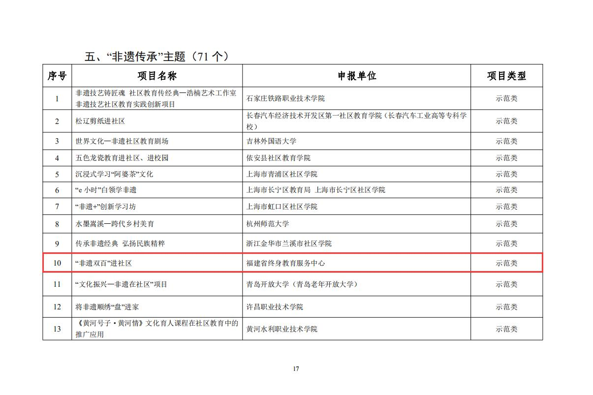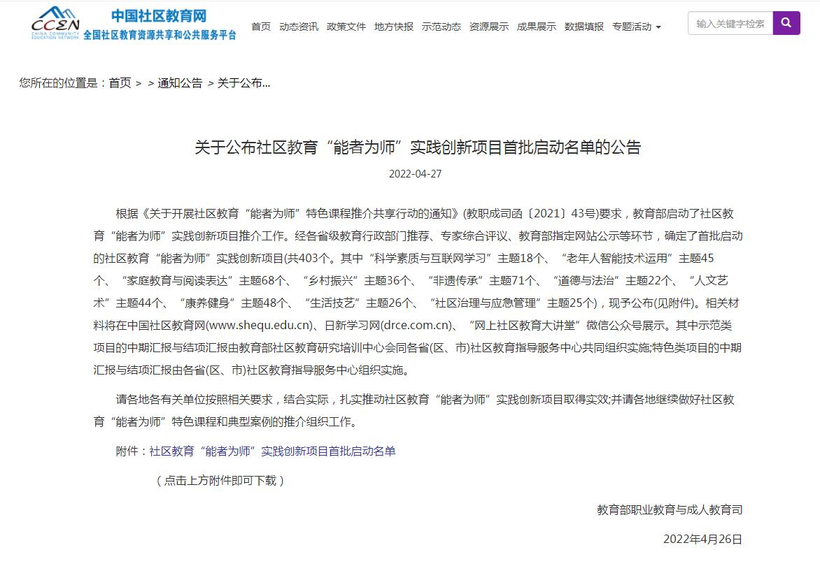 4月26日,教育部职业教育与成人教育司公布社区教育“能者为师”实践创新项目首批启动名单,我校申报的“‘非遗双百’进社区”项目入选。