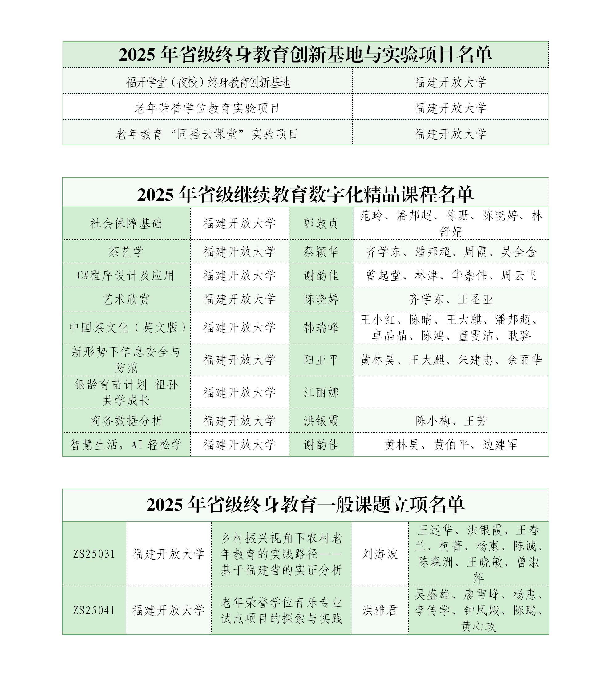 此次多个项目获批立项,充分展现了学校在终身教育领域的深耕实践与创新实力,彰显了学校在服务全民终身学习的学习型社会建设中的使命担当。多年来,学校始终坚持“以学习者为中心”的发展理念,积极响应国家关于“建设学习型社会”“积极应对人口老龄化”的号召,充分发挥开放办学体系优势,多措并举推动终身教育高质量发展。依托福建终身教育公共服务平台建设,汇聚优质数字化教学资源,形成覆盖城乡的数字化终身学习服务网络,推动优质终身教育资源向基层延伸、向老年群体倾斜、向发展薄弱地区辐射;通过探索老年荣誉学位音乐教育试点、创新开办“福开学堂”“福开夜校”等特色项目,持续丰富终身教育内涵,满足多样化学习需求;基于“同播云课堂”构建线上线下深度融合的老年教育OMO新模式,破解老年教育的痛点、难点,有效提升老年群体的参与度与获得感。