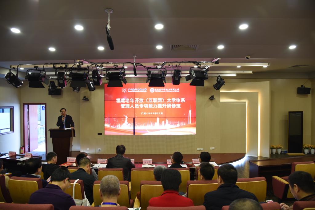 10日上午,“2019年福建老年开放(互联网)大学体系管理人员专项能力提升研修班”开班仪式在广州市广播电视大学麓湖校区举行。我校副校长沈光辉、广州市广播电视大学校长熊军及相关领导和工作人员出席了开班仪式,开班仪式由广州市广播电视大学终身教育学院孙朝霞副院长主持。